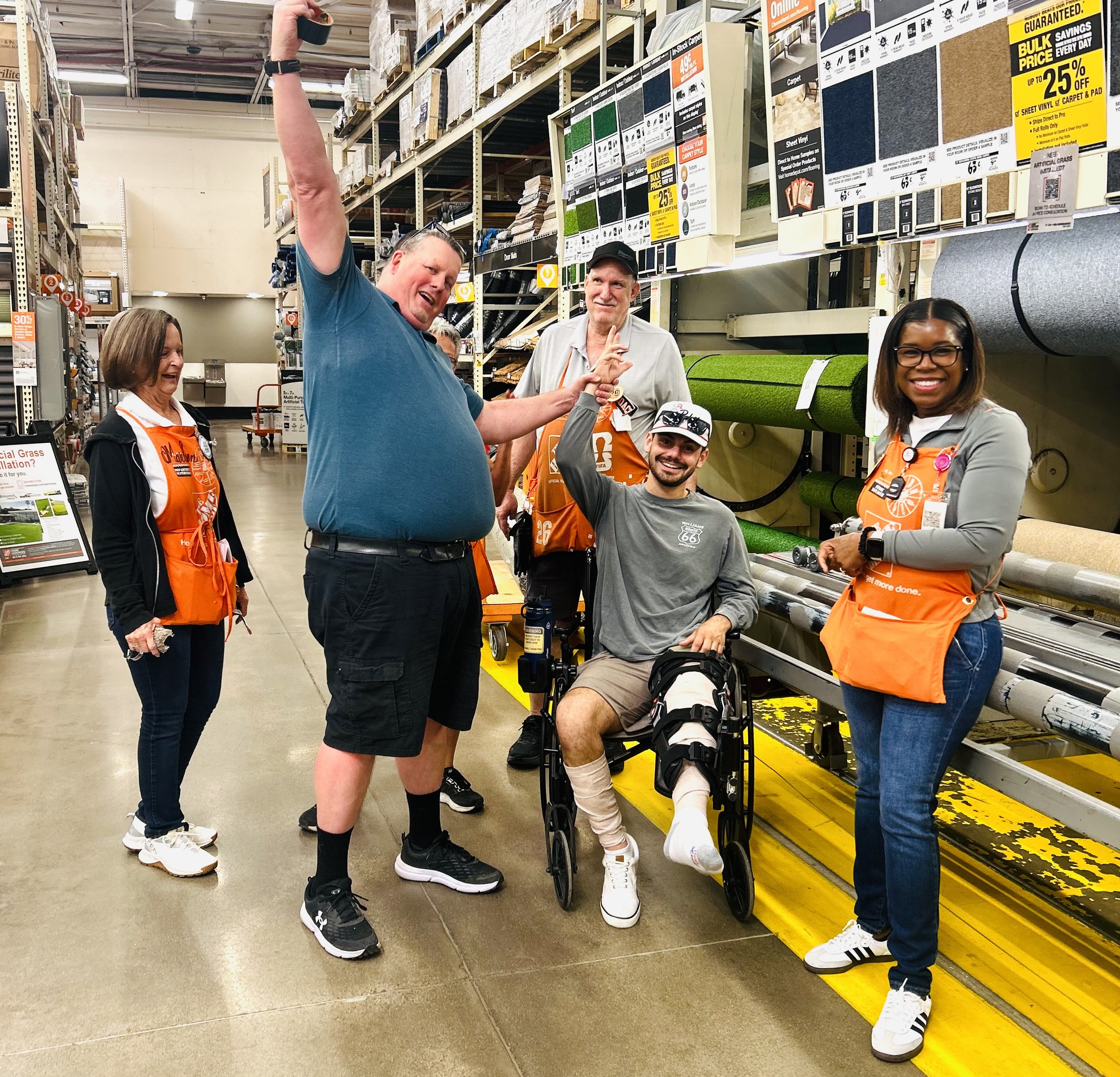 So the question is this “ how many Home Depot employees does it take to fix a loose cup holder on a wheelchair”? Well, this weekend we found out. Everyday I take Jake out of the house to get some exercise with the limbs that can work and to keep him from going stir crazy. That morning we went to Home Depot to get some new flowers for my patio. Jake also wanted to see if he could get something to fix his cup holder from slipping. There was one employee who was helping him so I decided to go get the flowers. About 15 minutes later I came back. As I turned the corner I heard some commotion and then saw this picture. What had been a simple task turned out to be an employee challenge! I couldn’t stop laughing. As one person thought they had the solution another one called on their radio for another person from another department to come until finally the store manager Tammy, came. And there was Jake, in the middle, in his wheelchair, trying to explain what wasn’t working. Finally, after five employees, the man in green, found the solution…yep, you guessed it…duck tape! We all laughed, Jake thanked everyone, and we went home. Last night at church I broke down and cried as a few people prayed for Kevin and I. As Bobby prayed he used the words “ step aside”, meaning allow God to do what is His purpose with Jake and the accident. But what hit me was more than that. Just like our experience at Home Depot, it took more than one person to help, and when they needed help they called for another one to help, until finally someone was able to find the solution. But Kev and I can’t do this alone…this journey with Jake is requiring so many other people, each with unique gifts, time, resources…God. And so I step aside and allow God to bring others to Jake who can help him in ways I cannot. How about you? Have you found out the resources you need is going to require the help of others? Have you asked for help? I know how difficult this can be but, as a certified control freak, some things in life can’t be handled alone…nor does God want us to do it alone. It is the reason He created people to need others…a community that reflects Him….like Jesus and His 12 disciples. When Jesus descended back to heaven He commanded ALL the disciples to go and share the good news…and He would be with them always. I am so grateful for those who have “stepped up” to help Jake, for those who have been praying daily for him, and to God, for all He is doing. I pray that if you need help, ask, pray, and step aside to see the miracles of God unfold before your very eyes. Thank you Home Depot employees for showing us what a community can do when we all work together for the good of others!